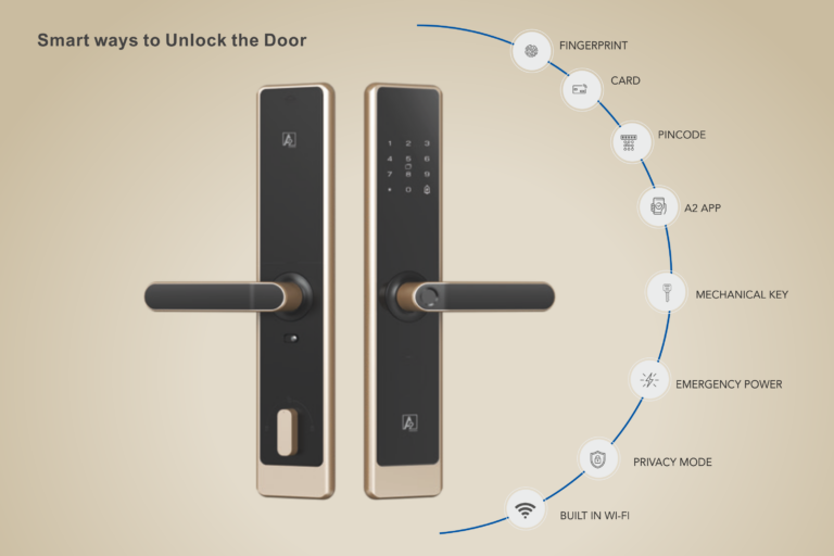 The A2 Alpha 30 series smart lock is a keyless electronic door lock designed to upgrade home or office security with modern convenience and multiple access methods. It fits most residential doors and combines biometric entry with digital and traditional unlock options for flexibility and safety. It offers multiple keyless access options including Fingerprint, PIN, RFID card, NFC Card, Mechanical key, and mobile app control.